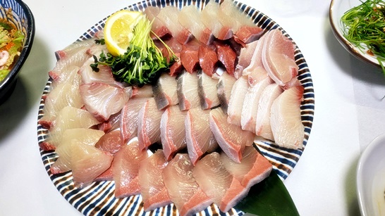 신선하게 썰어진 대방어는 그 품질이 한눈에 보이며, 부드러운 질감과 고소한 맛이 특징입니다.