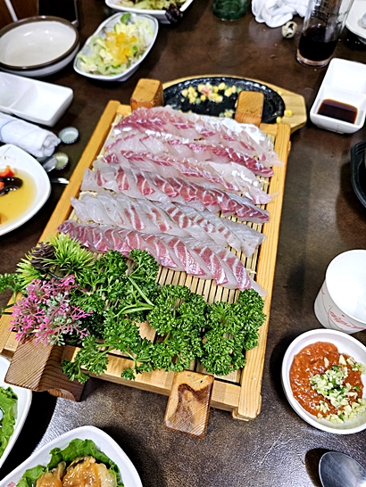 신선한 제철 회가 준비되며, 방어가 특히 인기입니다.