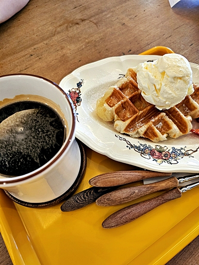 바삭하게 구워진 겉면과 쫀득한 식감, 바닐라 아이스크림과 딸기잼 조합이 정말 잘 어울려요.