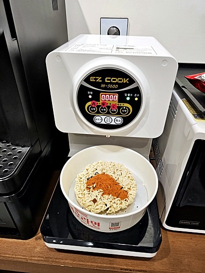로비 키오스크에서 칫솔·치약 세트(500원), 라면(3,500원) 등 간단한 어메니티를 바로 결제해 받을 수 있습니다.
