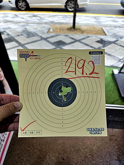 제가 직접 체험한 결과, 소총 2회를 진행, 26발을 쏘았고 최종 점수는 219.2점이 나왔습니다.