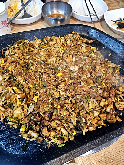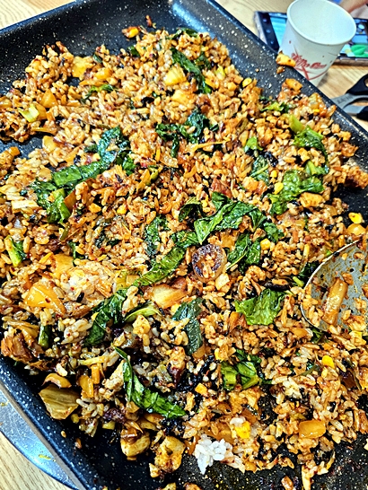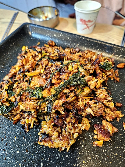 직원분이 고기, 김치, 콩나물을 잘게 썰어 김치국물과 참기름, 김을 넣고 볶아주는데, 더 맛있게 먹는 방법이 있습니다.