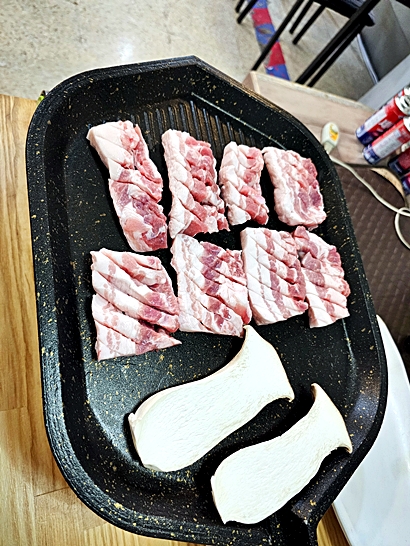 삼겹살은 선홍빛이 도는 신선한 고기로 굽는 동안 육즙이 잘 살아납니다.