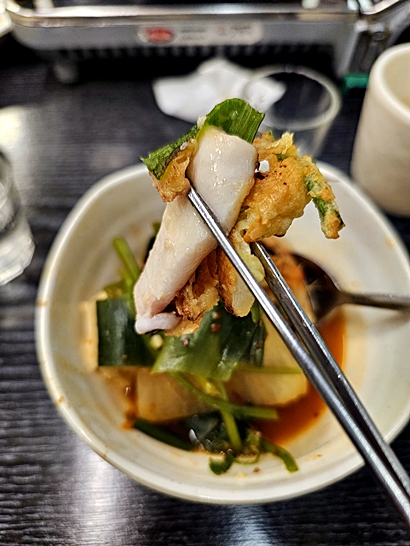 My personal recommendations are the seafood pancake, pollack stew, grilled pork with green onions, and spicy pollack roe and milt dish. The pancake is crispy outside and soft inside, perfect with makgeolli. The pollack stew has a spicy, clean taste, great for a meal or hangover relief. The grilled pork with green onions is savory and unique. The spicy pollack roe and milt dish is rich and perfect as both food and drinking side. After finishing it, mixing rice with the leftover sauce for fried rice is a must. In winter, dried fish called gwamegi is also available and is worth trying.