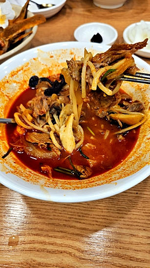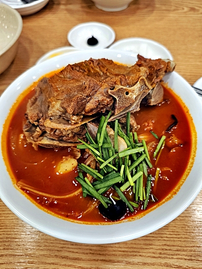 등뼈가 통째로 들어간 국물 요리로, 짬뽕이라기보다 ‘매운 등뼈탕과 중식의 만남’ 같은 느낌입니다.