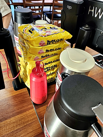 반찬 셀프바와 음료 코너도 정리되어 있어 자율적으로 이용할 수 있었습니다.