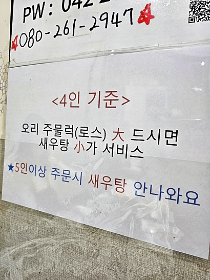 4인 기준 주문이 베스트 조합 – 오리주물럭 대자 주문 시 새우탕 소자 서비스