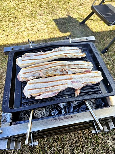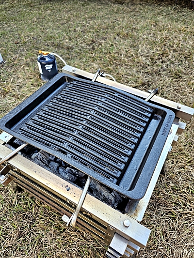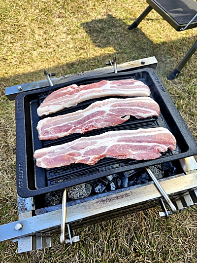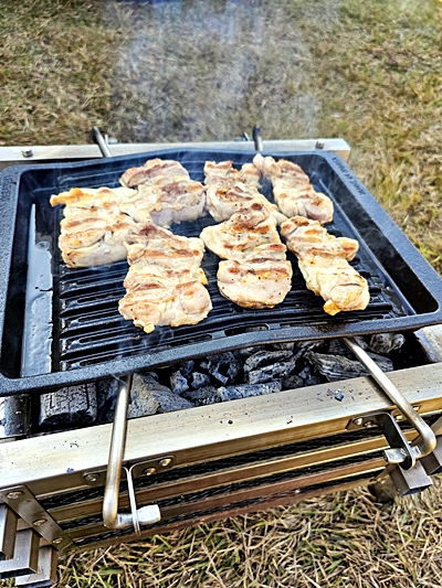 불꽃이 올라오는 걸 막아주기 때문에 초보 캠퍼도 안정적으로 굽기 가능