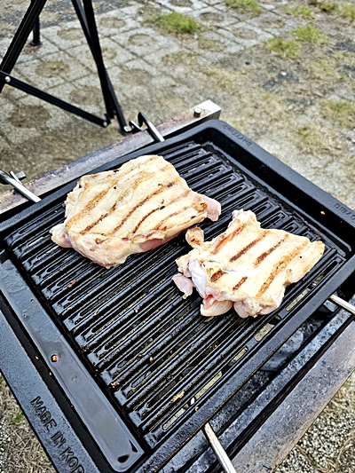 For the first test, I grilled chicken thighs. They cooked evenly, and the heat spread well across the grill. The meat stayed juicy inside while the outside became crisp. I could already feel the difference from normal thin grills.