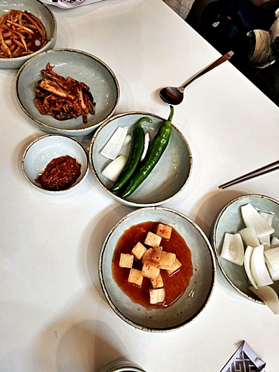 기본찬은 깍두기, 배추김치, 양파, 고추, 무생채 등이 준비되어 있고