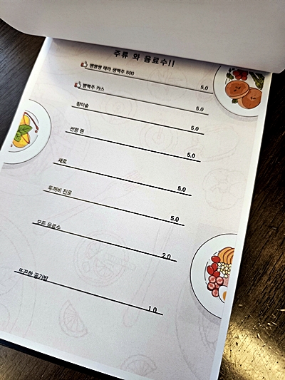 생맥주, 참이슬, 린, 카스 등 주류 메뉴도 준비되어 있음