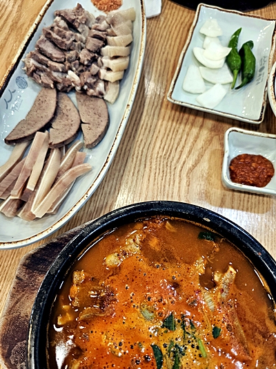 This is a simple review of Bugangok, a long-running handmade sundae soup restaurant in Bugang-myeon, Sejong. I visited again with my family and tried the spicy sundae soup and the small plate of boiled meat. The restaurant is easy to find, and the large open yard makes parking simple even during busy hours. The exterior feels like a traditional local restaurant, and the inside is bright, clean, and family-friendly, with a self-serve station for side dishes like radish kimchi, onions, chili peppers, and seasoning paste. Bugangok opens at 8 a.m. and closes at 8 p.m., with Tuesday as a regular day off. There is a weekend break time in the afternoon, so checking the schedule before visiting is helpful. For this visit, I ordered the spicy sundae soup, but it was not as spicy as expected. The flavor was rich, warm, and clean, but I personally think the basic sundae soup shows the restaurant’s real taste better. The small boiled meat set, priced at 16000 won, was very satisfying. The texture of the meat was soft and clean, and there were several cuts of meat on the plate. Everything tasted fresh and well prepared. During meal hours, the restaurant gets crowded, but service stays quick because of the tablet-ordering system. A few tips: first-time visitors should try the basic sundae soup rather than the spicy one. Arriving early helps avoid long waits, especially on weekends. If you use the CatchTable app, you can check waiting in advance. Overall, Bugangok is a solid choice for anyone who wants a hearty and comforting bowl of sundae soup. It is dependable, tasty, and perfect for families looking for a warm meal.