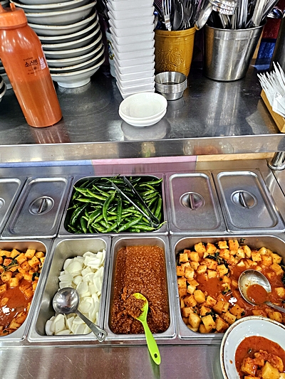 기본 깍두기부터 고추, 양파, 다대기 등이 깔끔하게 준비되어 있어 원하는 만큼 가져다 먹을 수 있어요.