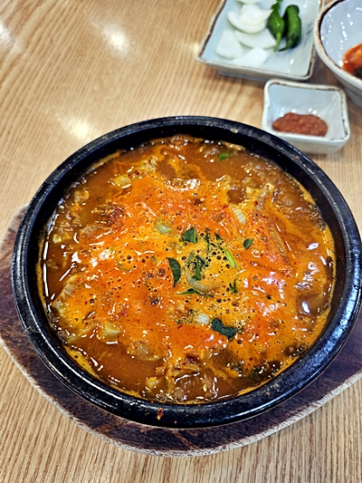 국물은 보글보글 끓으며 빨간빛이 도는 얼큰 스타일이지만, 맵기보다는 진하고 구수한 맛이 강했습니다.