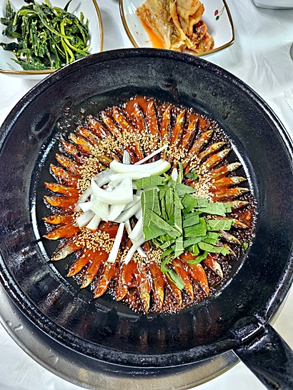 커다란 철판 위에 민물고기를 둥글게 돌려 구운 모습이 정말 예술이에요.