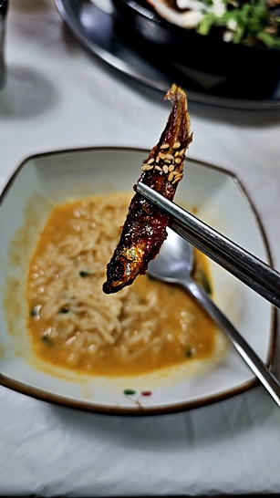 함께 주문한 어죽은 된장 베이스 국물에, 민물 특유의 잡내 없이 깔끔한 맛을 자랑했습니다.