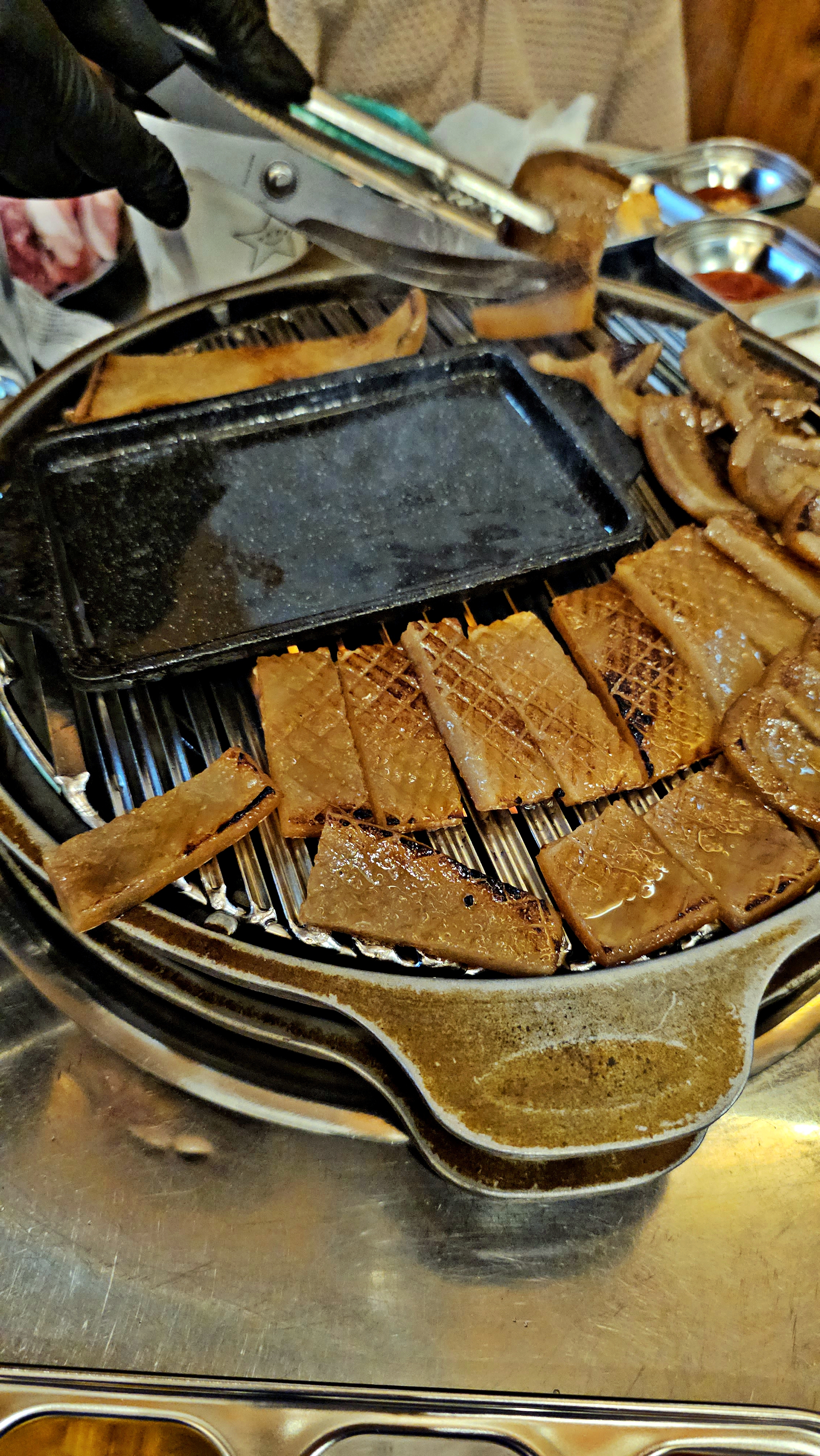 불판 위에서 천천히 굽다 보면 겉은 바삭하게 결이 서고,