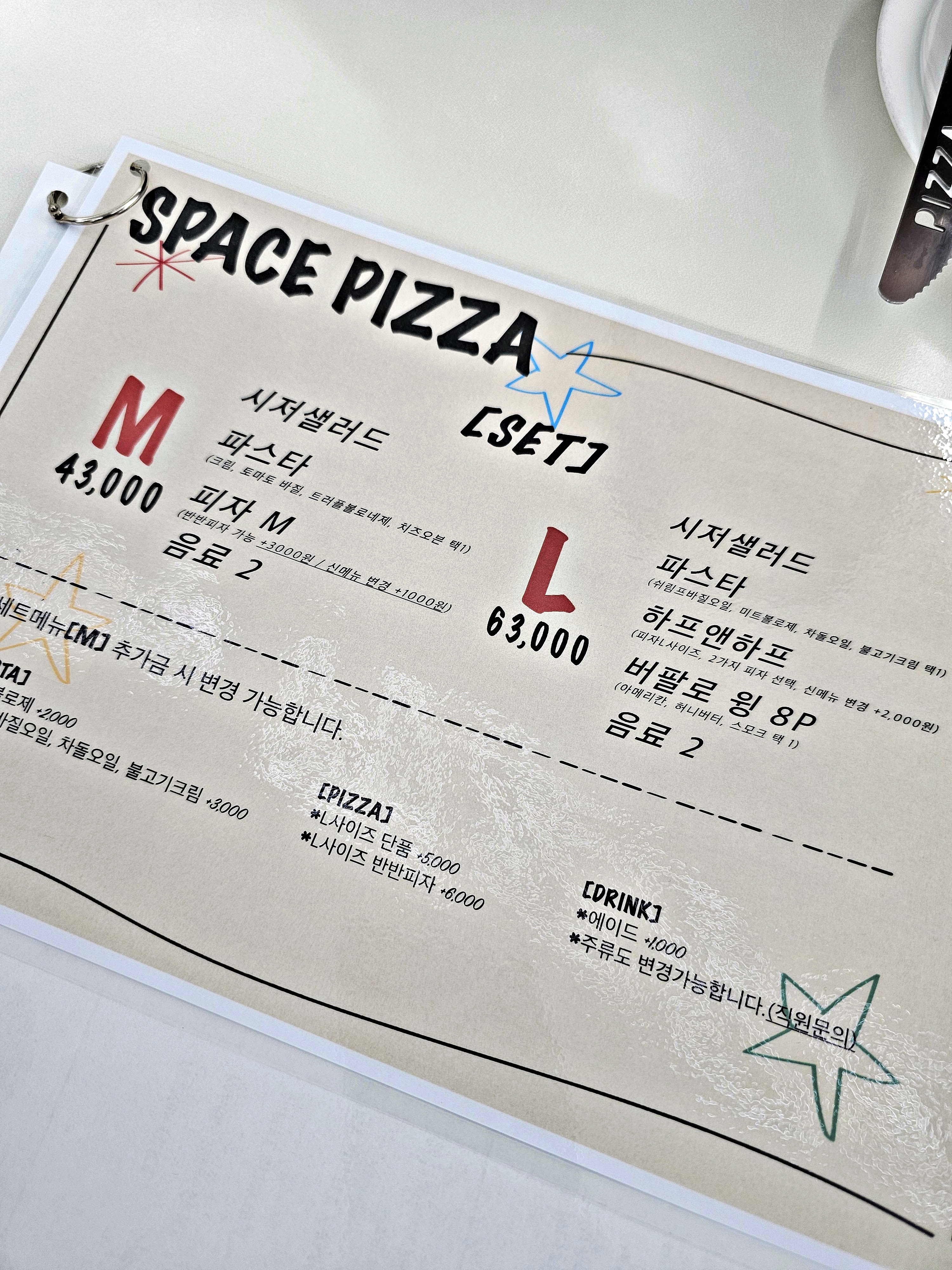 We visited Space Pizza in Naseong-dong, Sejong with our kids for a family meal. It is easy to find in the main commercial area, and parking is available in the building, though it can get busy at dinner time. We ordered the L set and added one more half-and-half pizza. Our total was 88,900 won. The L set included a Caesar salad, pasta (we chose the meatball rose option with a small extra charge), a half-and-half pizza, drinks, and wings. The best part was the pizza. The cheese was rich and savory, and the dough had a clear American-style texture that is hard to find. The outside felt clean and lightly crisp, while the inside stayed chewy and elastic, so each bite had a nice bounce. The half-and-half option was perfect for a family because everyone could pick what they like. We tried bulgogi, pepperoni, and a taco-style flavor, and each one had a strong, clear taste. The toppings and cheese stayed well balanced on the dough, so the slices felt complete and satisfying. The side menu was fine but less impressive than the pizza. If you visit, it makes sense to focus your order on pizza rather than 기대 too much from the sides. The shop looks bright and clean inside, but we noticed some echo in the dining area. The music was not loud, yet the sound in the room made us feel slightly uncomfortable during the meal. If you are sensitive to noise, choose a seat near the wall or visit at a quieter time. Overall, this is a place we recommend for the pizza itself. If you want a well-made American-style pizza dough in Sejong, this spot delivers. Our score is 4.6 out of 5 because the pizza was excellent, while the sides were average and the echo in the hall was a small downside.