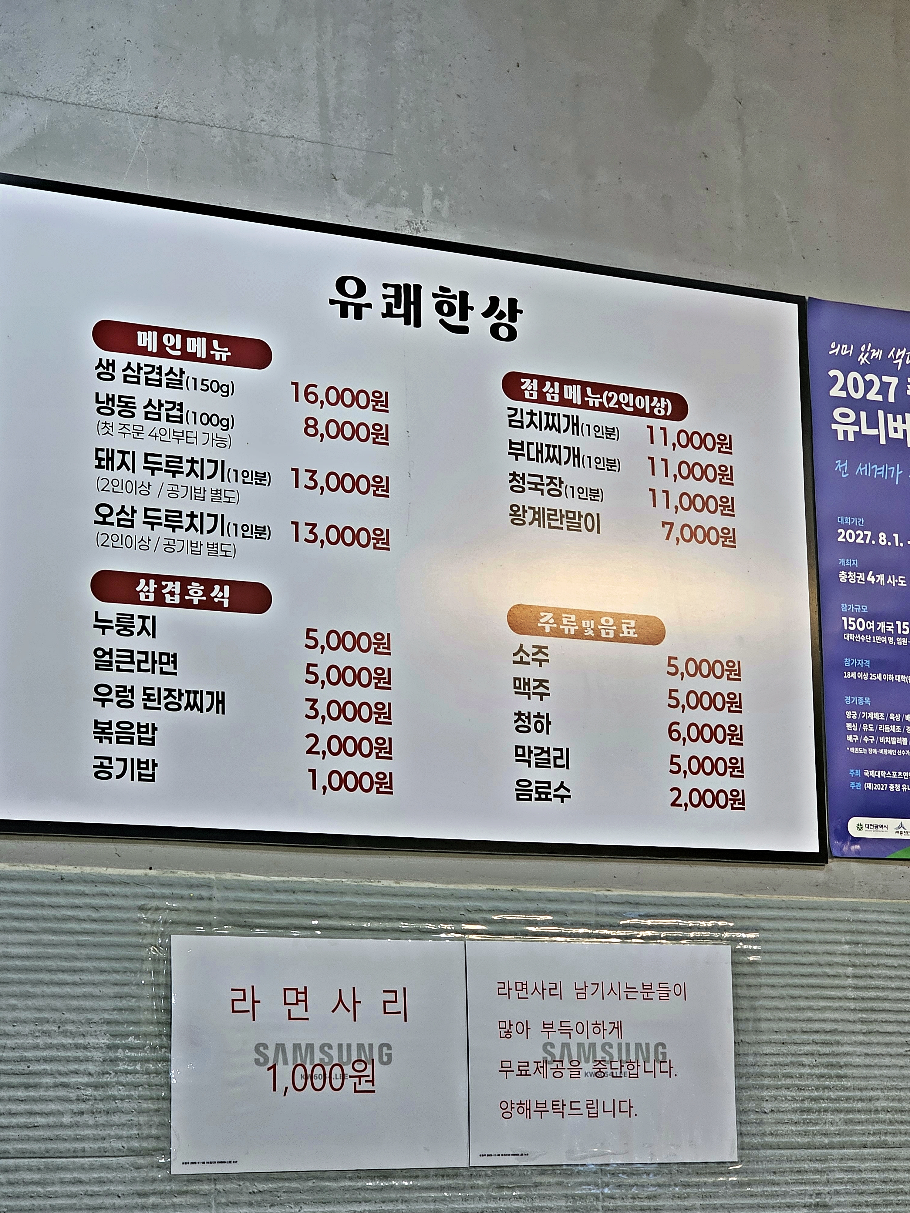 후식으로 누룽지 5,000원, 얼큰라면 5,000원, 우렁된장찌개 3,000원, 볶음밥 2,000원, 공기밥 1,000원도 보였어요.