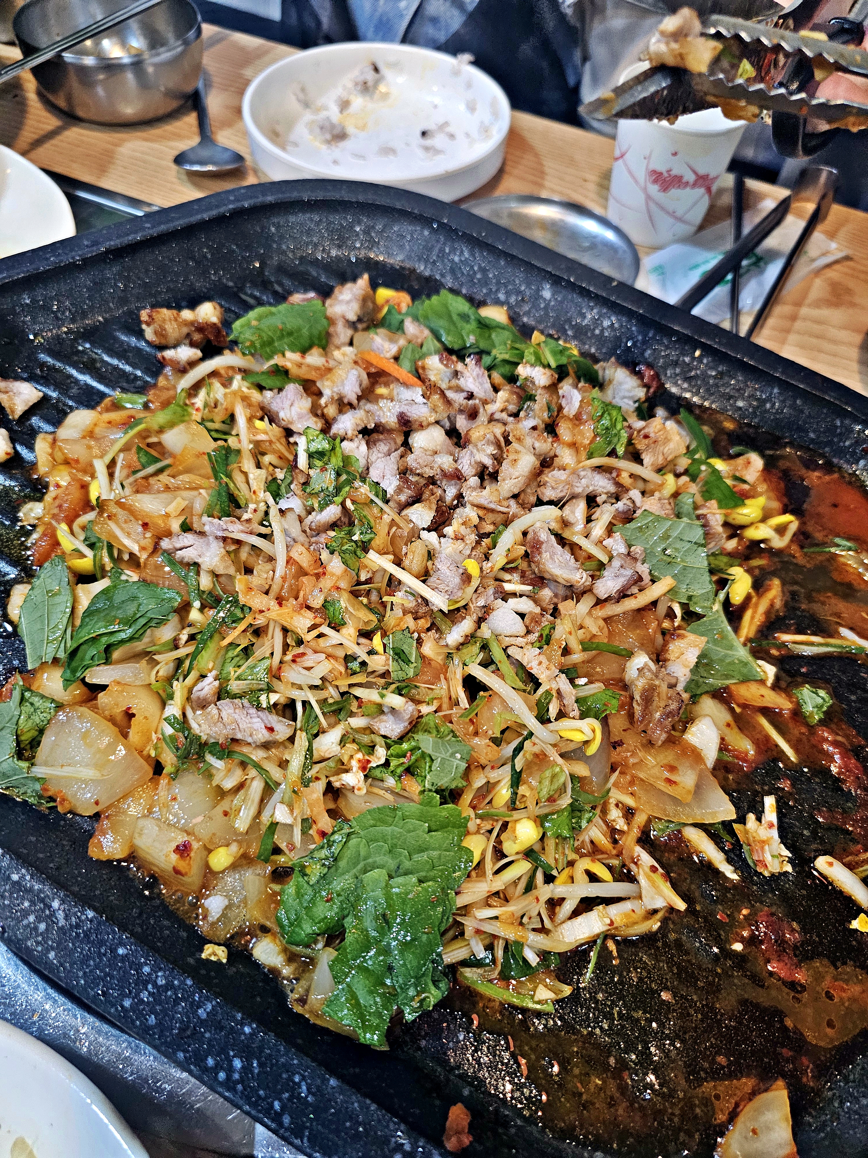 불판에 남은 고기와 김치, 야채를 잘게 섞어 볶으면 고소함이 확 올라와요.