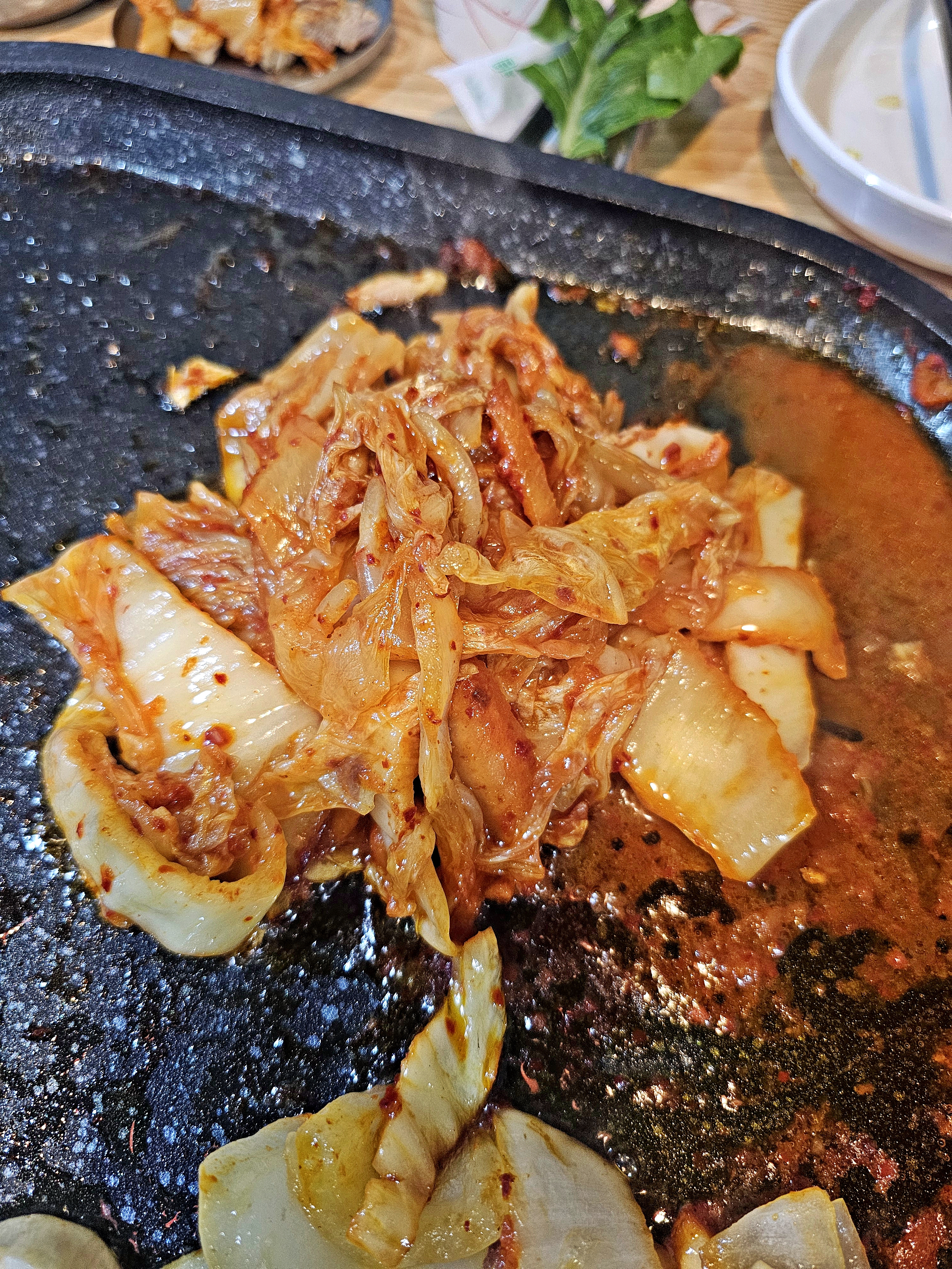 김치를 같이 구우면 산미가 고기 기름을 잡아줘서 끝까지 물리지 않아요.