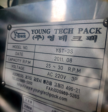 제조사 영테크팩, 모델 YST-3S, 제조년월 2011년 8월(명판 기준), 전원 AC 220V 3상(3P)입니다.
