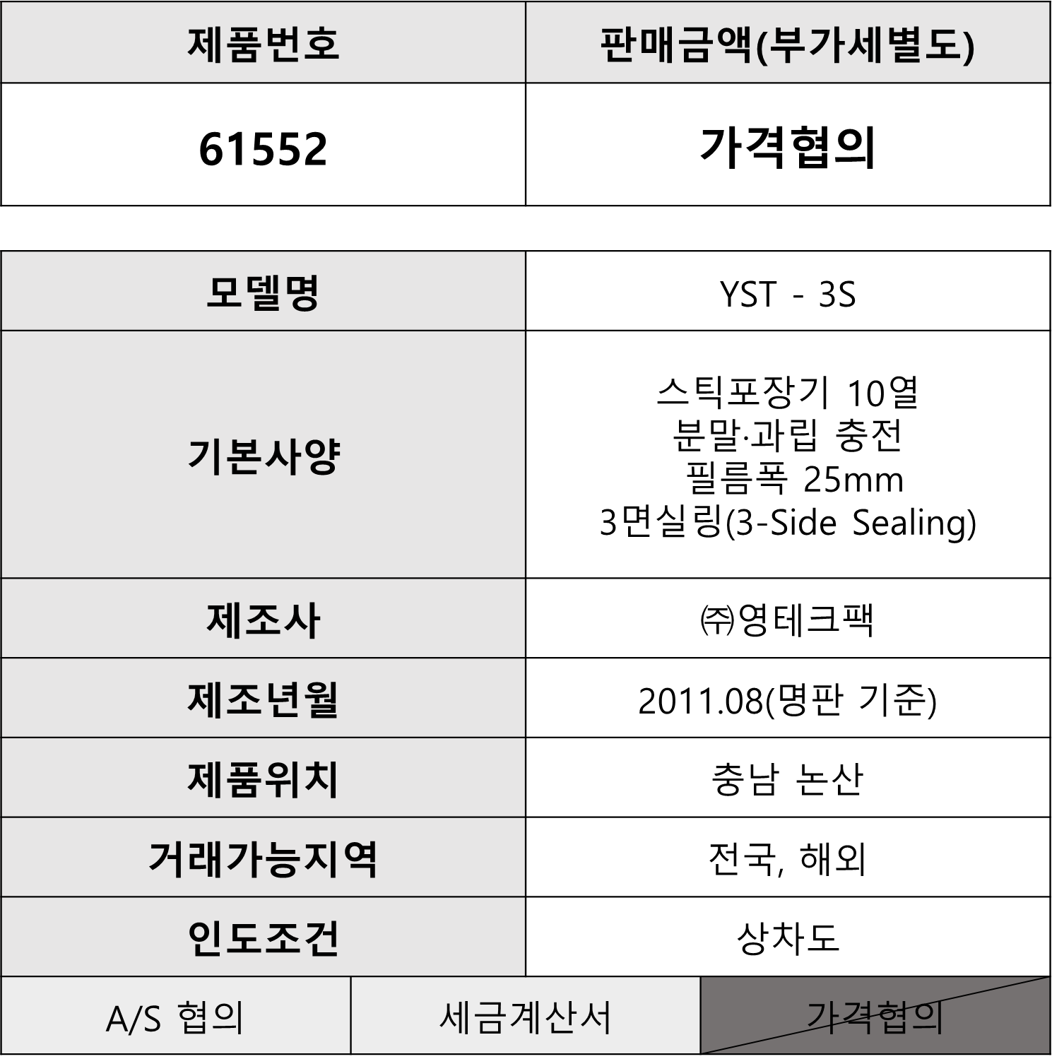 제품 번호 61552, 제품 위치 충남 논산, 거래 가능 지역 전국 및 해외, 인도 조건 상차도입니다.
