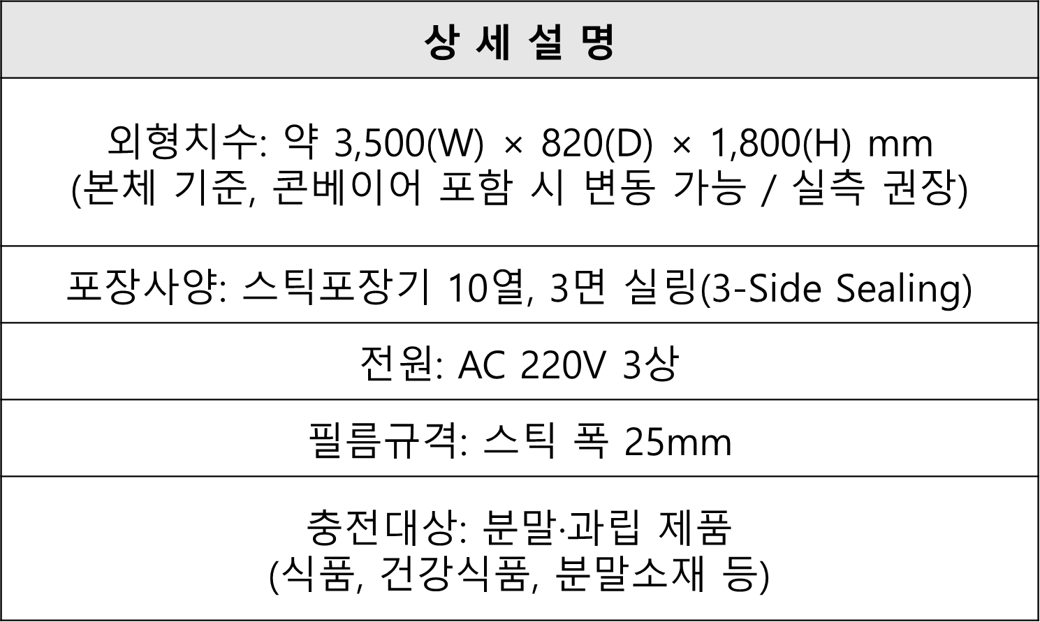 10열이라는 생산 구조, 25mm 스틱 규격, 분말 과립 대응, 220V 3상 전원은 구매자가 판단하기 쉬운 스펙입니다.
