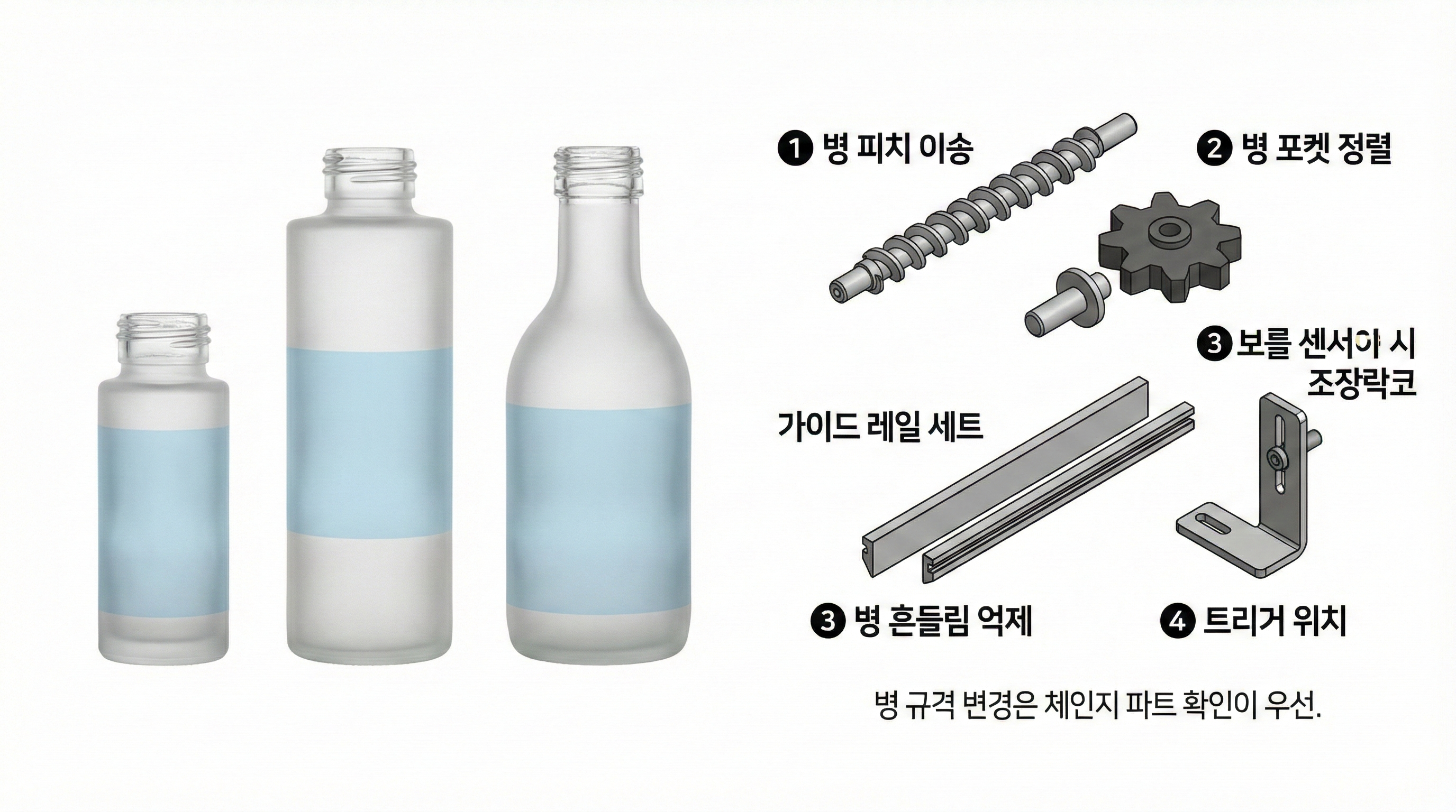 병 규격 변경 시 스타휠, 가이드, 스크류 등 체인지 파트 비용이 수반될 수 있음