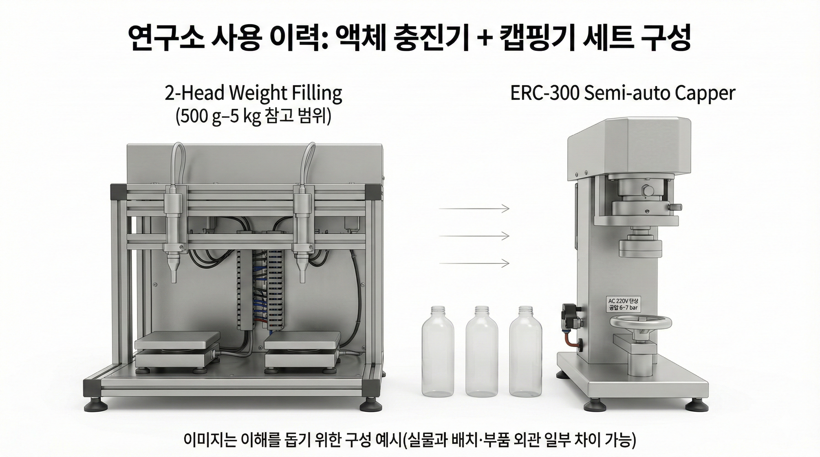 소개해 드릴 장비는 한샘테크의 2헤드 액체 충진 시스템과 이레파마텍의 반자동 보틀 캡핑기 ERC-300 세트입니다.