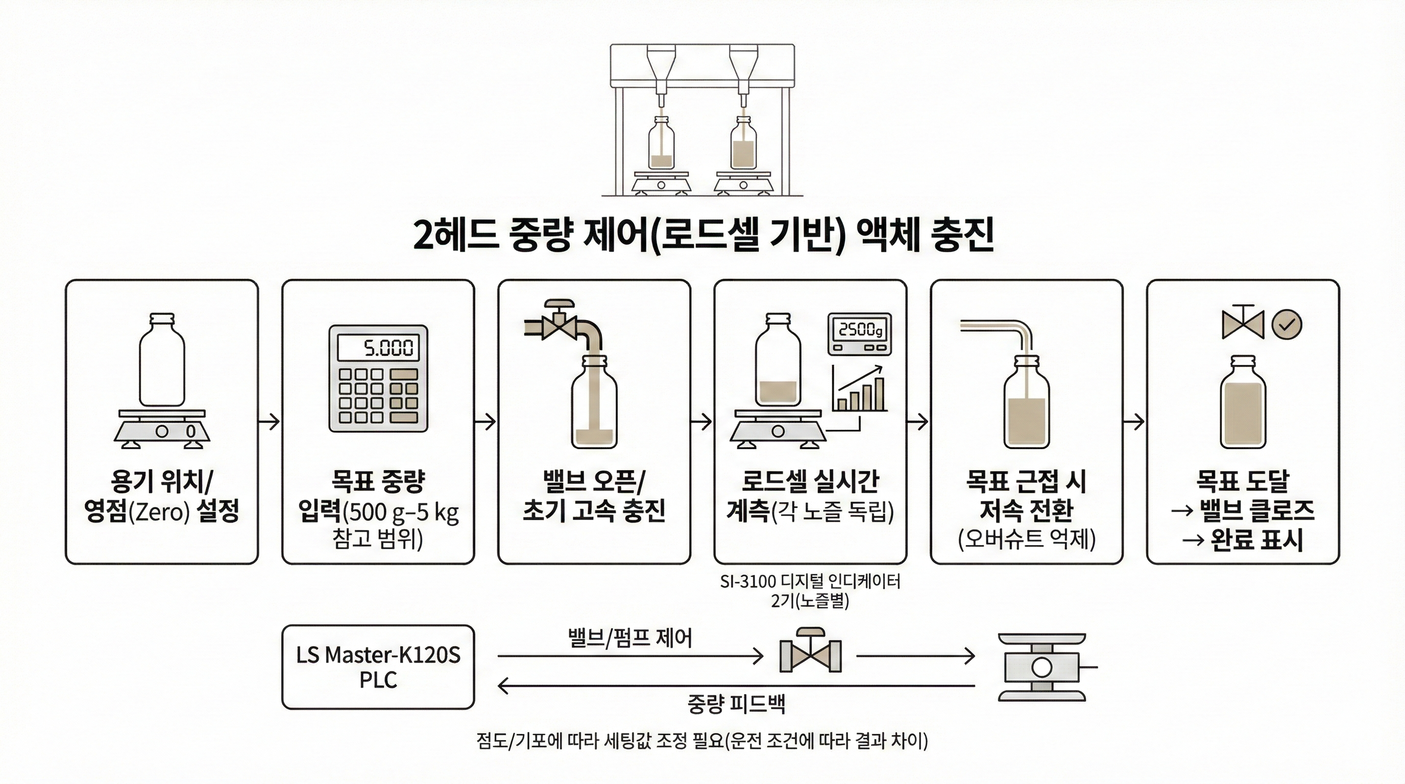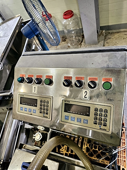 The filling machine is made by a company called Hansaem Tech. It has two filling heads and can handle liquid weights from 500g up to 5kg. It uses two Sewha SI-3100 digital indicators to make sure every bottle is filled accurately. Inside the control box, there is a high quality LS Master-K PLC. This part is made in Korea, so it is very reliable and easy to maintain.
