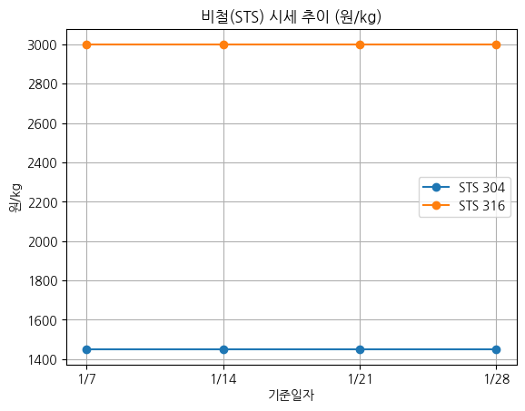 | 기준일 | 생철 | 경량 | STS 304 | STS 316 |