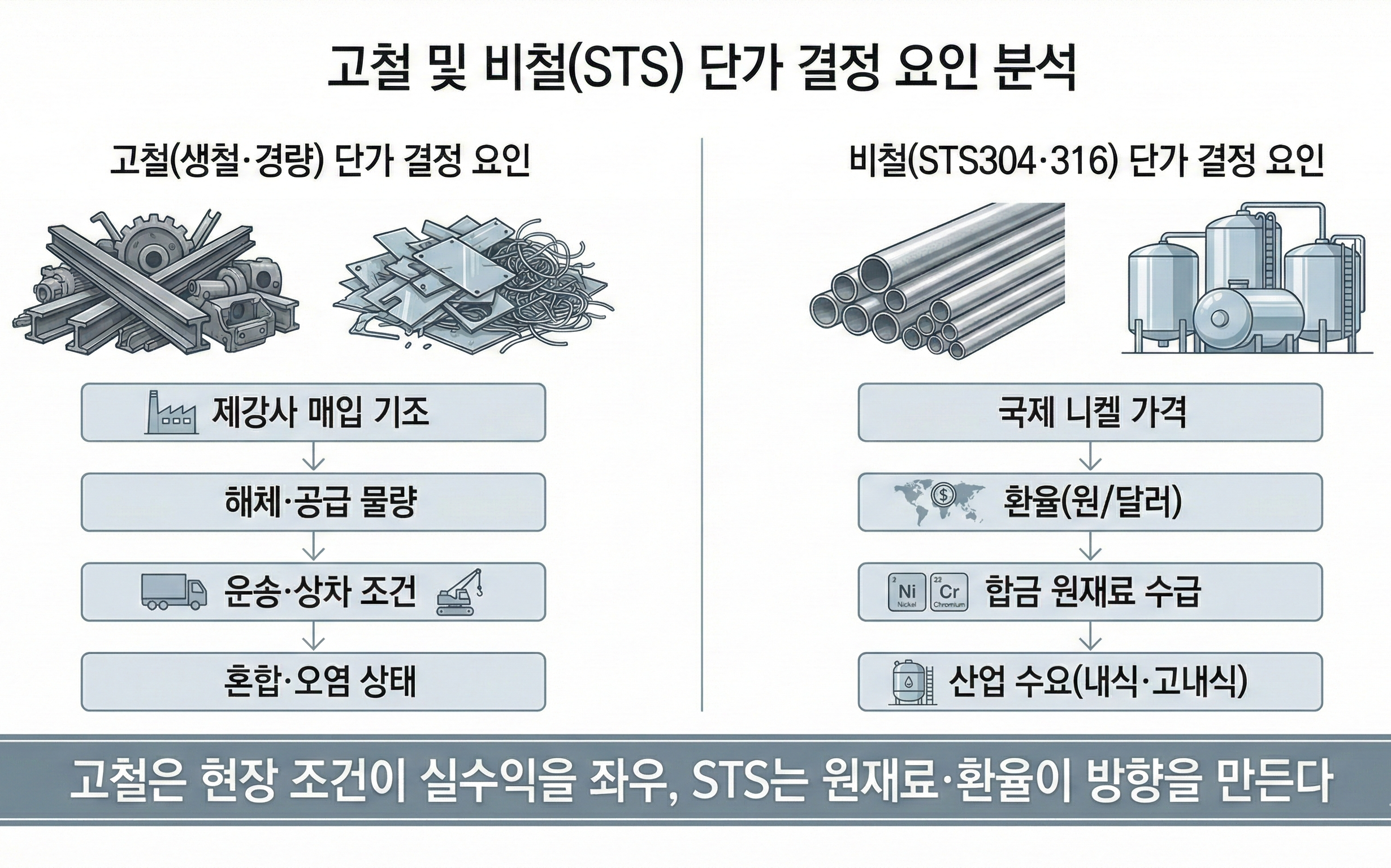 STS는 자석 반응(혼입), 고철은 비철 혼입·오염부터 정리하면 단가 방어가 쉬워집니다.