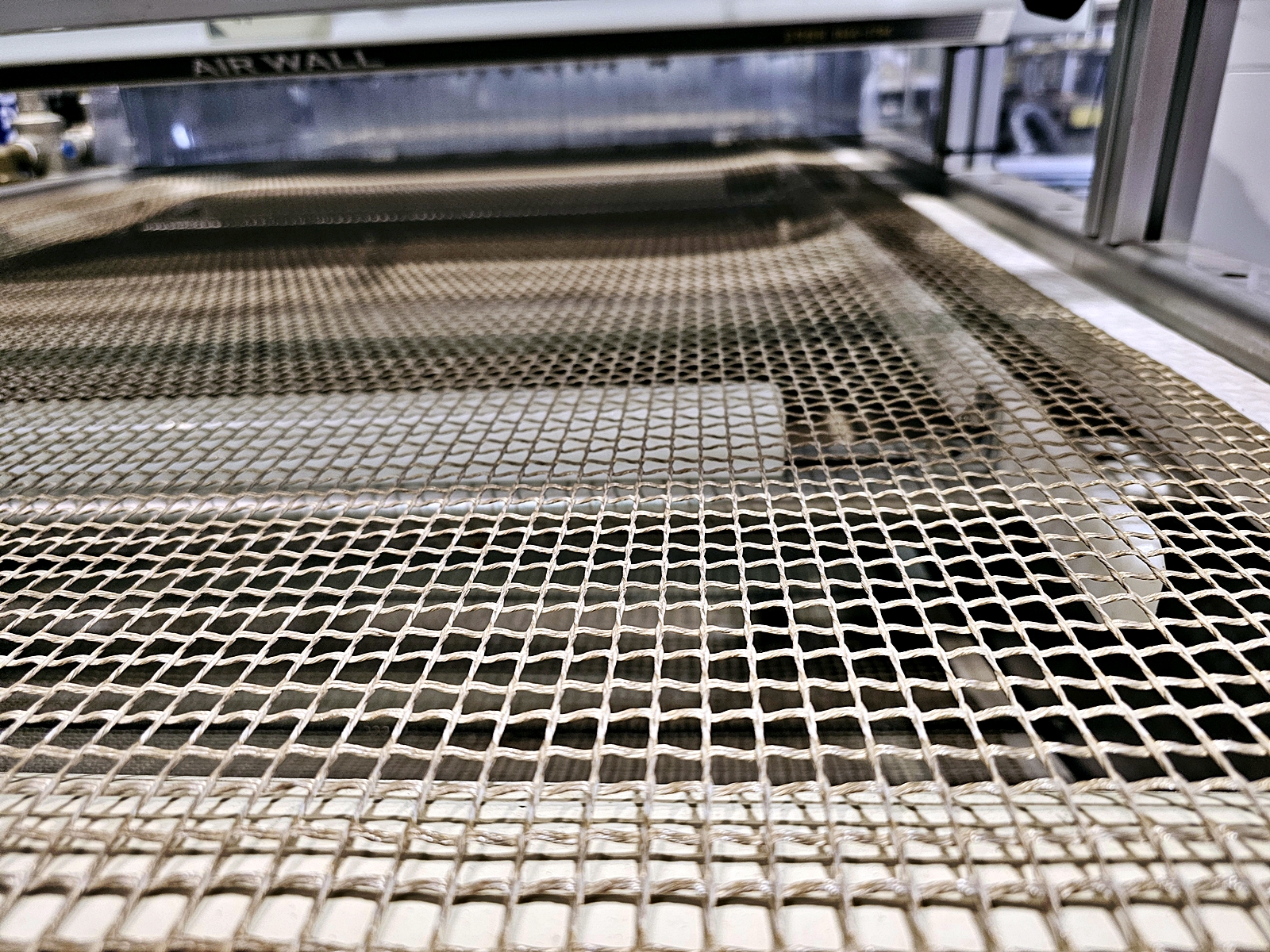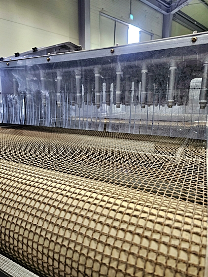 세척 공정은 메시 벨트형 컨베이어를 통해 원료가 이동하며 상단과 하부에서 고압수를 분사하는 방식으로 진행됩니다.