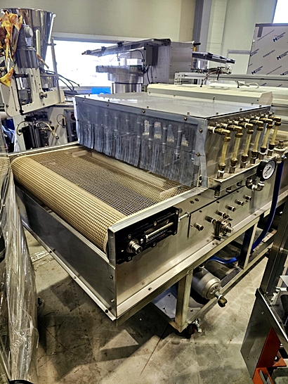 세척이 끝난 원물은 출구 쪽에 위치한 송풍 장치인 에어 나이프를 거치며 표면 물기가 제거된 상태로 배출됩니다.