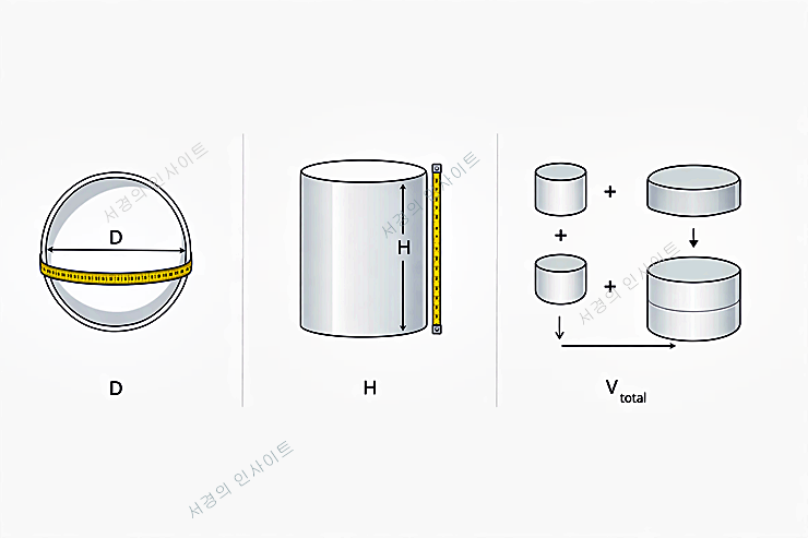 본 포스팅의 치수 및 용량 계산은 수공구(줄자 등) 실측값과 표준 형상 공식을 기반으로 한 참고용 자료입니다.