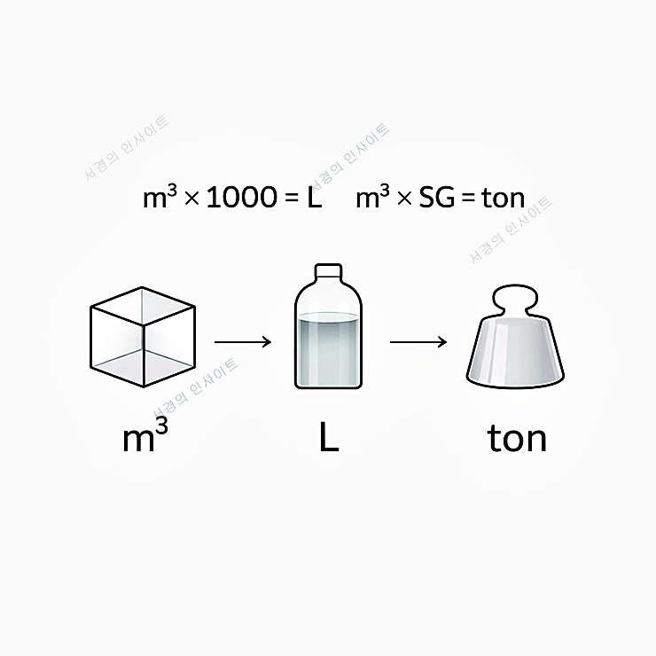 물은 SG=1이라서 m³ 값이 톤과 거의 같습니다.