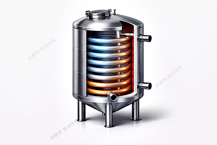 탱크 내부에 코일을 넣고 코일 안으로 열매체를 흘립니다.